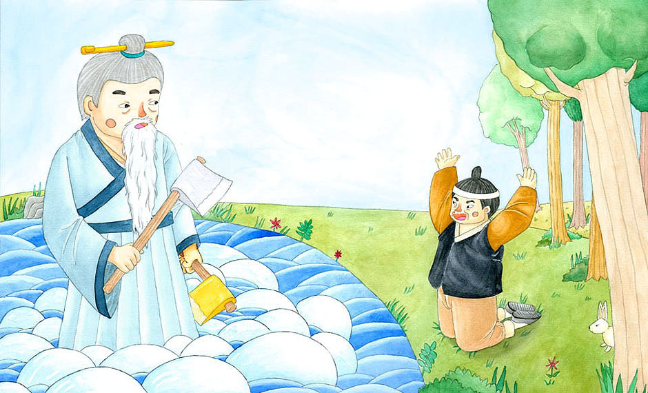 나무꾼은 고개를 저으며 대답했지요. 나무꾼의 말을 들은 산신령은 고개를 끄덕이고는 연못으로 사라졌어요.