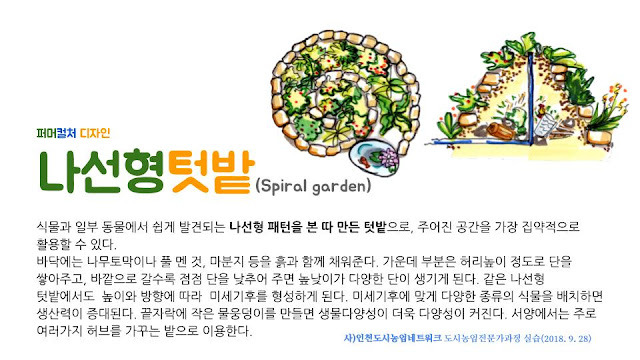 나선형텃밭은 빙글 돌아가면서 점차 가운데로 높아지는 텃밭으로 식물과 일부동물에서 나타나는 패턴을 본타 디자인한 텃밭이다.