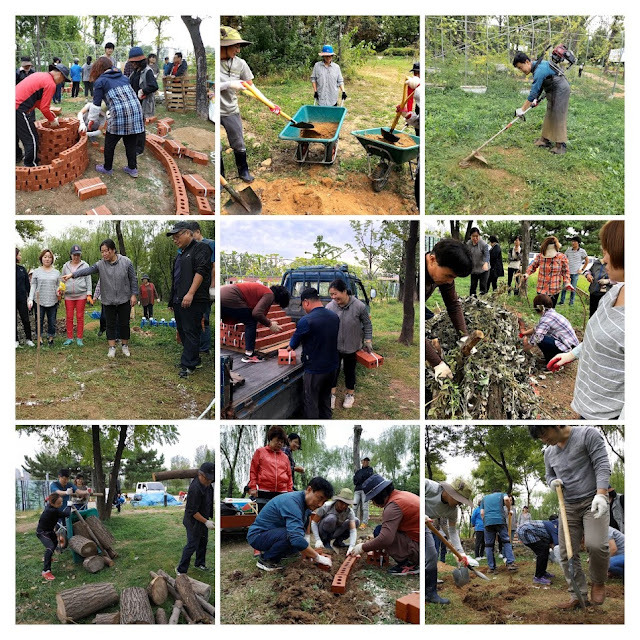 30명의 수강생들이 3개조로 나뉘어 텃밭에 조성에 필요한 재료를 모으고 땅을 돋아 텃밭을 만들었다. 4시간 가까이 되는 시간에 얼추 80%정도 완성을 시켰다. 시간이 약간 모자라 흙과 작물심기를 마치지 못한것이 아쉬웠지만, 다들 새롭게 만들어진 조형물에 뿌듯해했다.